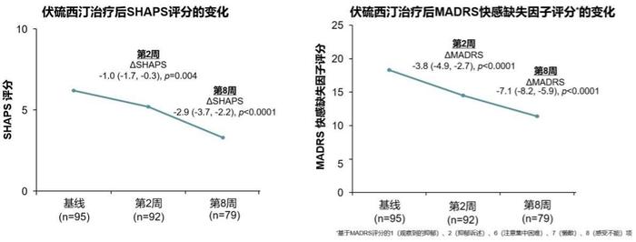 伏硫西汀治疗第2、8周后,SHAPS总分和MADRS快感缺失因子评分得到显著且持续的改善(图1)。