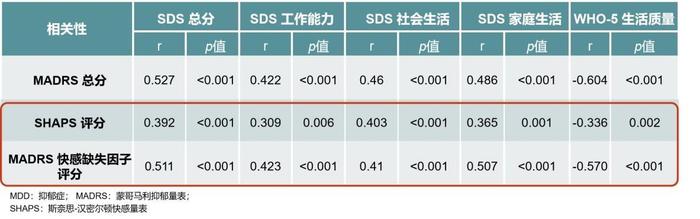 表1. 从基线期开始,功能障碍、幸福感和快感缺失终点变化的相关性