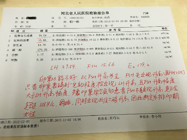 当女性卵巢功能出现衰退首先出现的是FSH升高。当绝经后一段时期才会出现LH升高。具体原因尚不明确。当女性卵巢功能衰退后FSH升高早于LH升高,且通常FSH升高幅度较LH明显。关注下面几份报告中LH水平的不同。代表了卵巢衰竭后的时间。LH水平越高代表卵巢衰竭的时间越久。