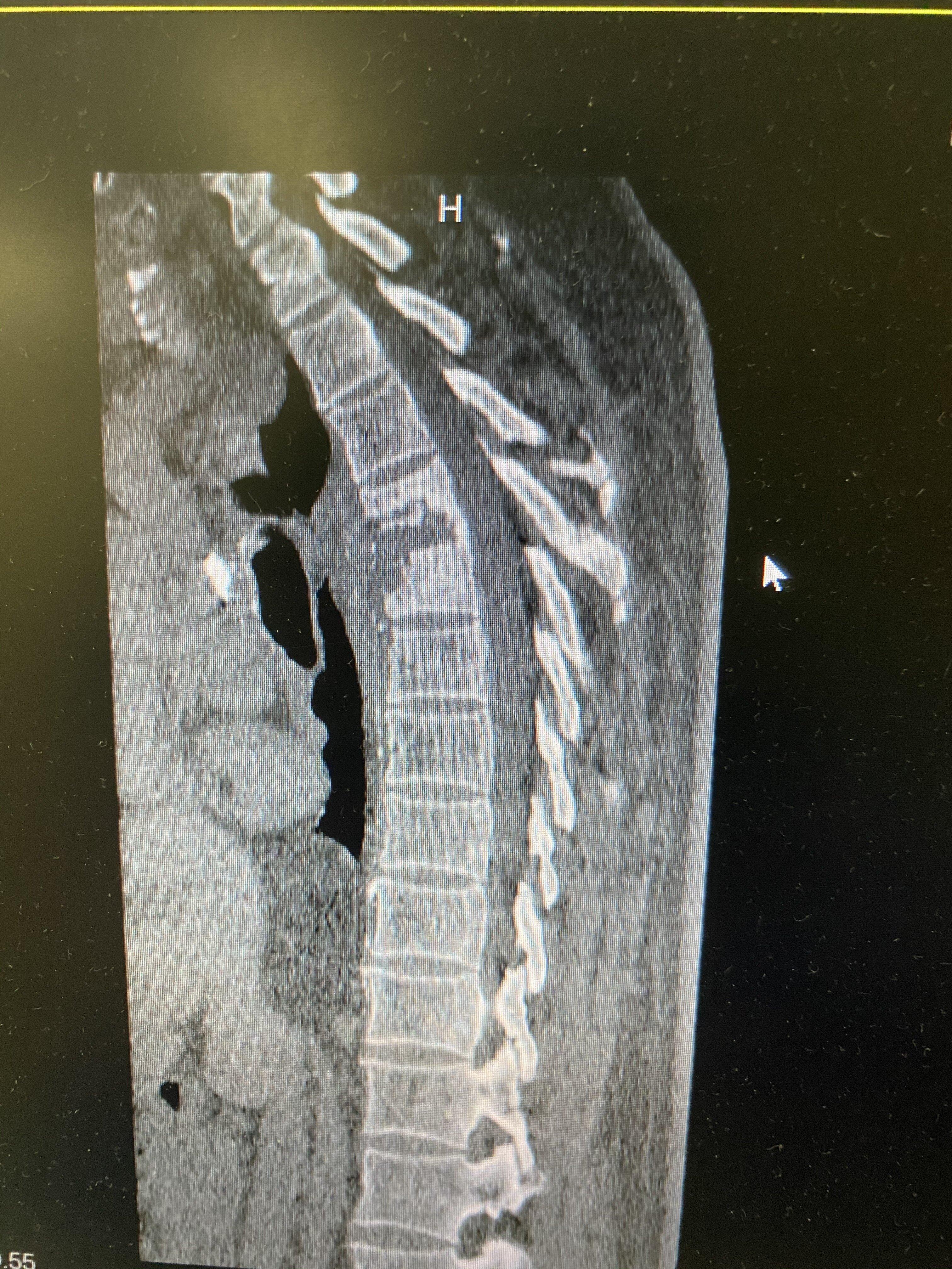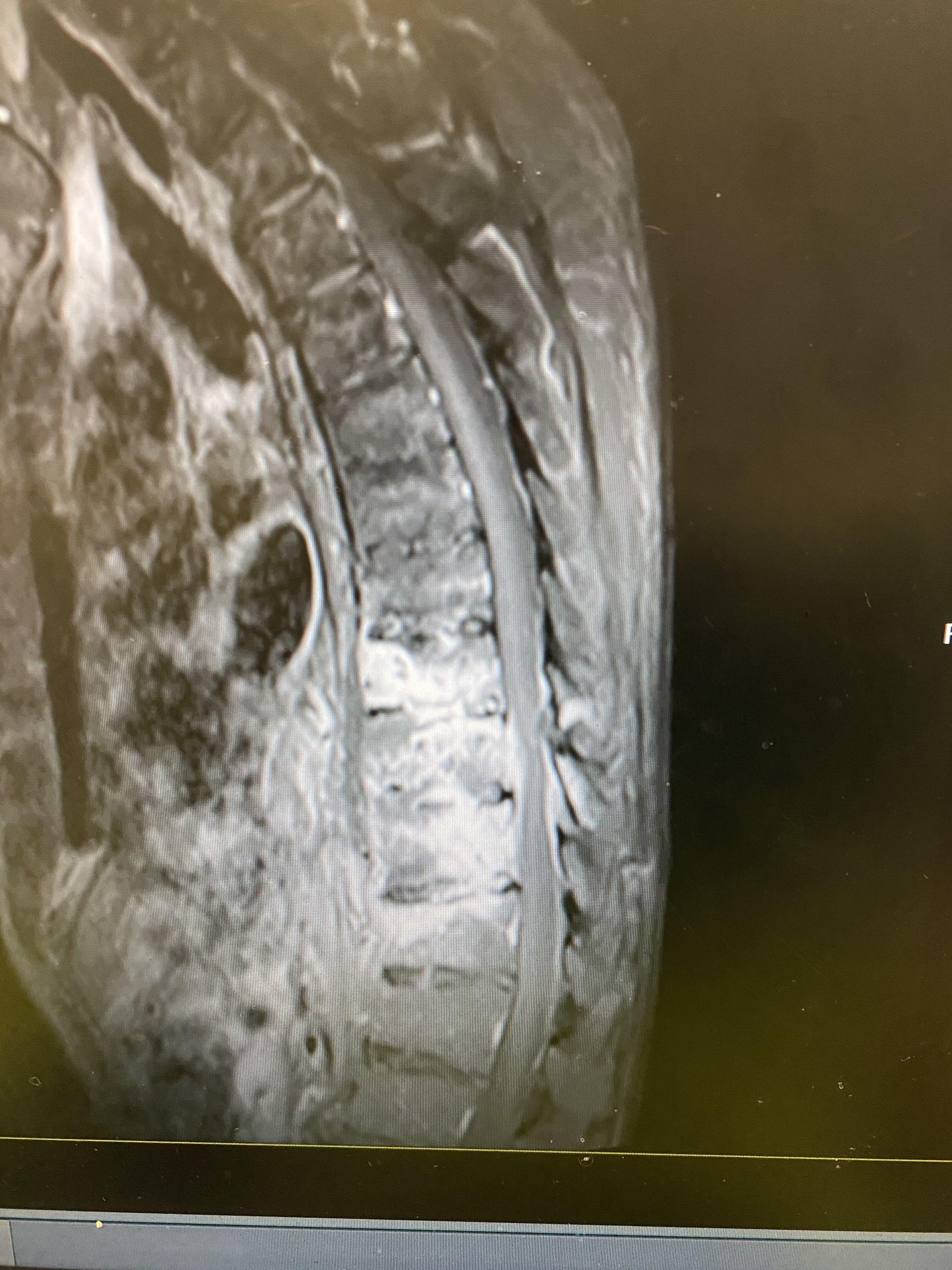 该患者老年男性,肺结核,低热乏力行抗结核治疗两个月以后,持续胸痛、背痛,无法缓解。做胸椎核磁共振和CT考虑胸椎结核,椎体椎间盘结合病灶,椎旁脓肿形成,椎体破坏明显。