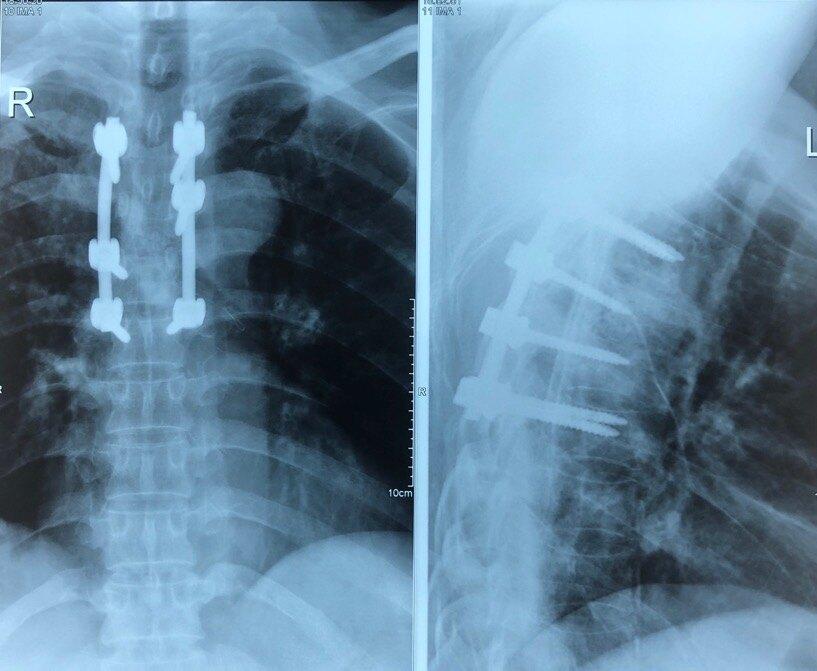 患者的胸椎结核病灶得到清除,胸椎破坏以后形成的椎间不稳定得到加固,患者疼痛明显缓解,并且避免了脊柱稳定性破坏引起的脊柱侧弯和后突畸形,后续继续进行抗结核治疗,能够得到完全治愈。