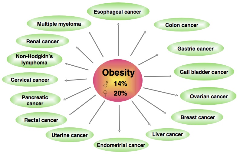 Excess weight gain, overweight, and obesity are associated with an increased risk of many cancers; recently, the International Agency for Research on Cancer reported that there is sufficient evidence to conclude that avoidance of excess body fat is associated with a lower risk for cancers of the endometrium, esophagus (adenocarcinoma), gastric cardia, kidney (renal cell), multiple myeloma, meningioma, liver, pancreas, colorectum, gallbladder, breast (postmenopausal), ovary, and thyroid.[8] There also is growing observational evidence that obesity is associated with poorer cancer outcomes among individuals with cancer.