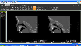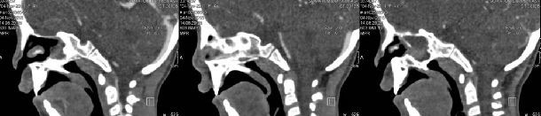 我们检查发现,患儿张口呼吸,不断流鼻涕,发音不清晰,言语功能同其他行耳蜗植入两年后的儿童之言语能力有很大差别。CT检查发现,后鼻孔处有骨性的结构连于硬腭与蝶骨之间,完全阻塞后鼻孔。如图。