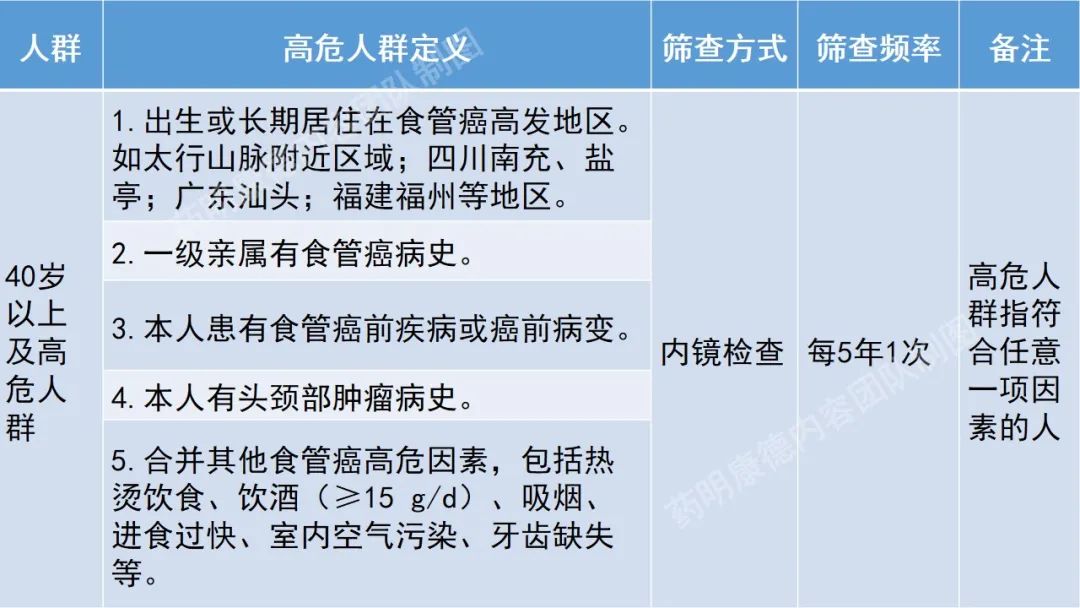 食管癌高危人群定义及筛查方式和频率,如下图所示:
