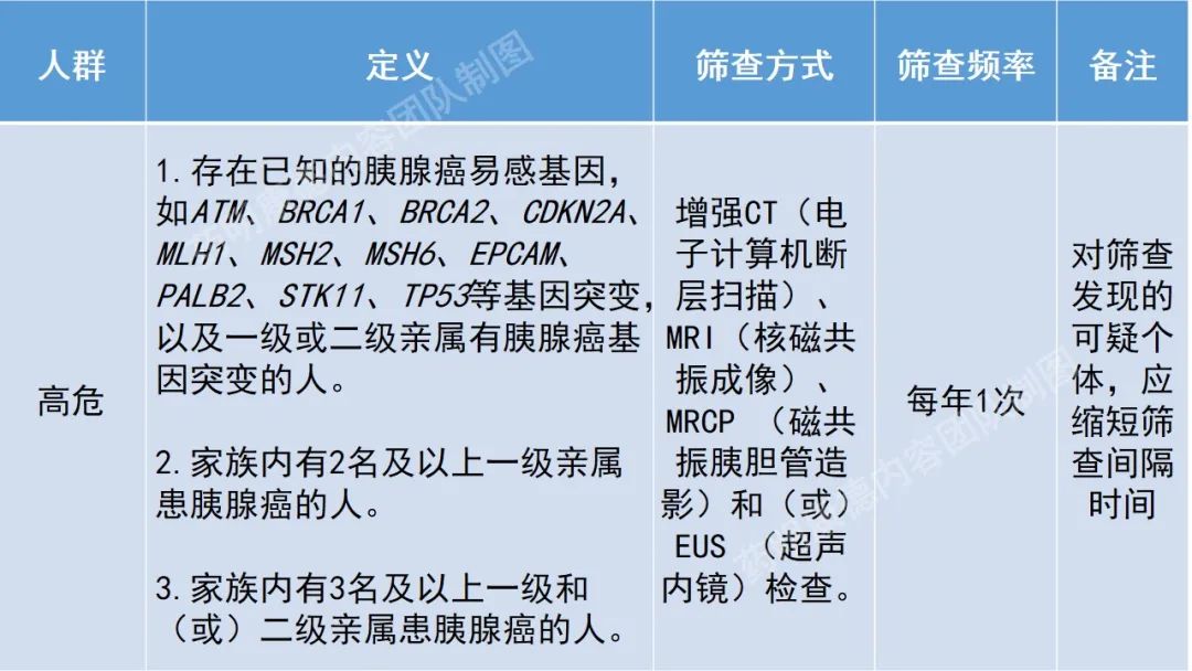 胰腺癌高危人群定义及筛查方式和频率,如下图所示: