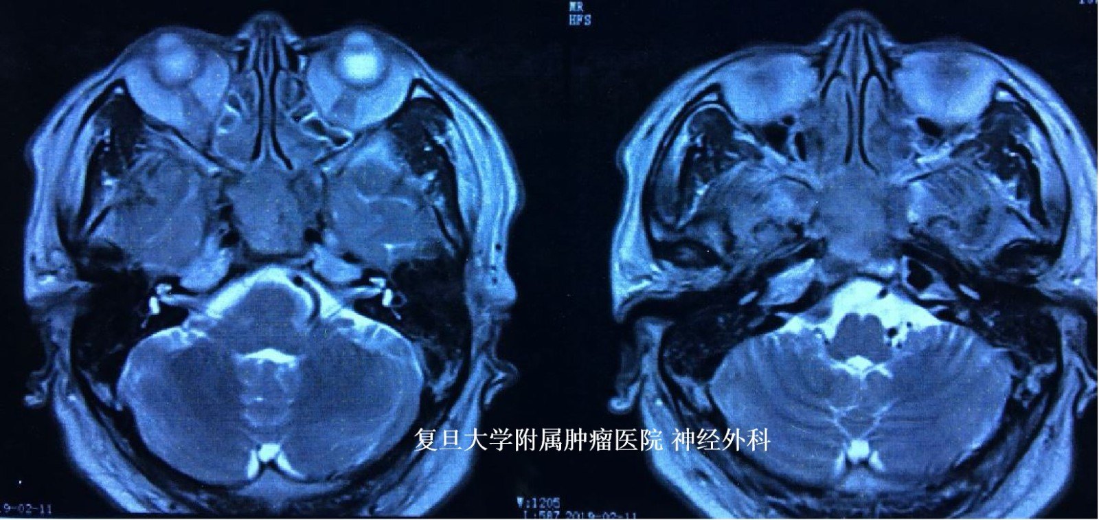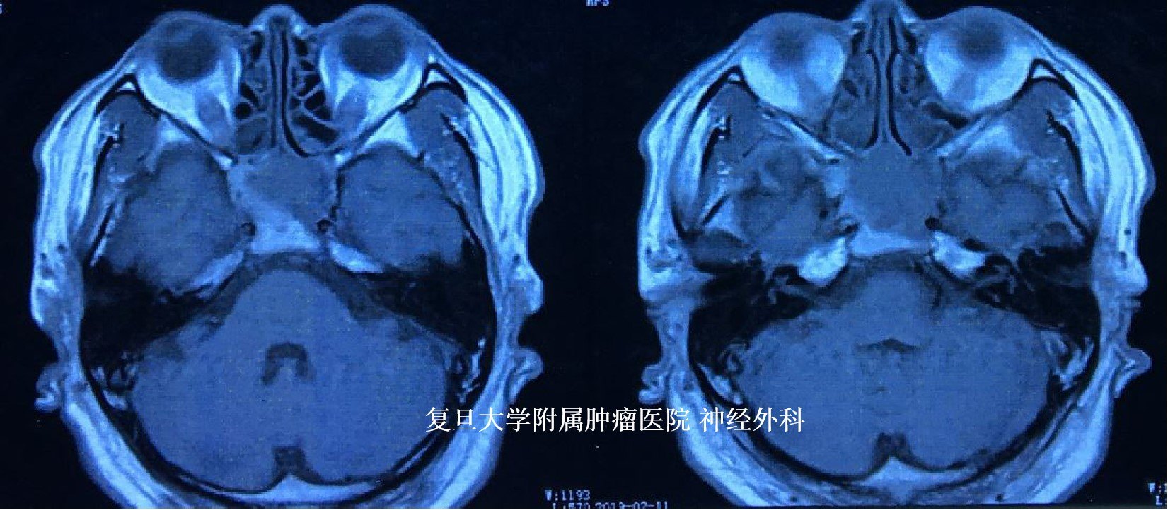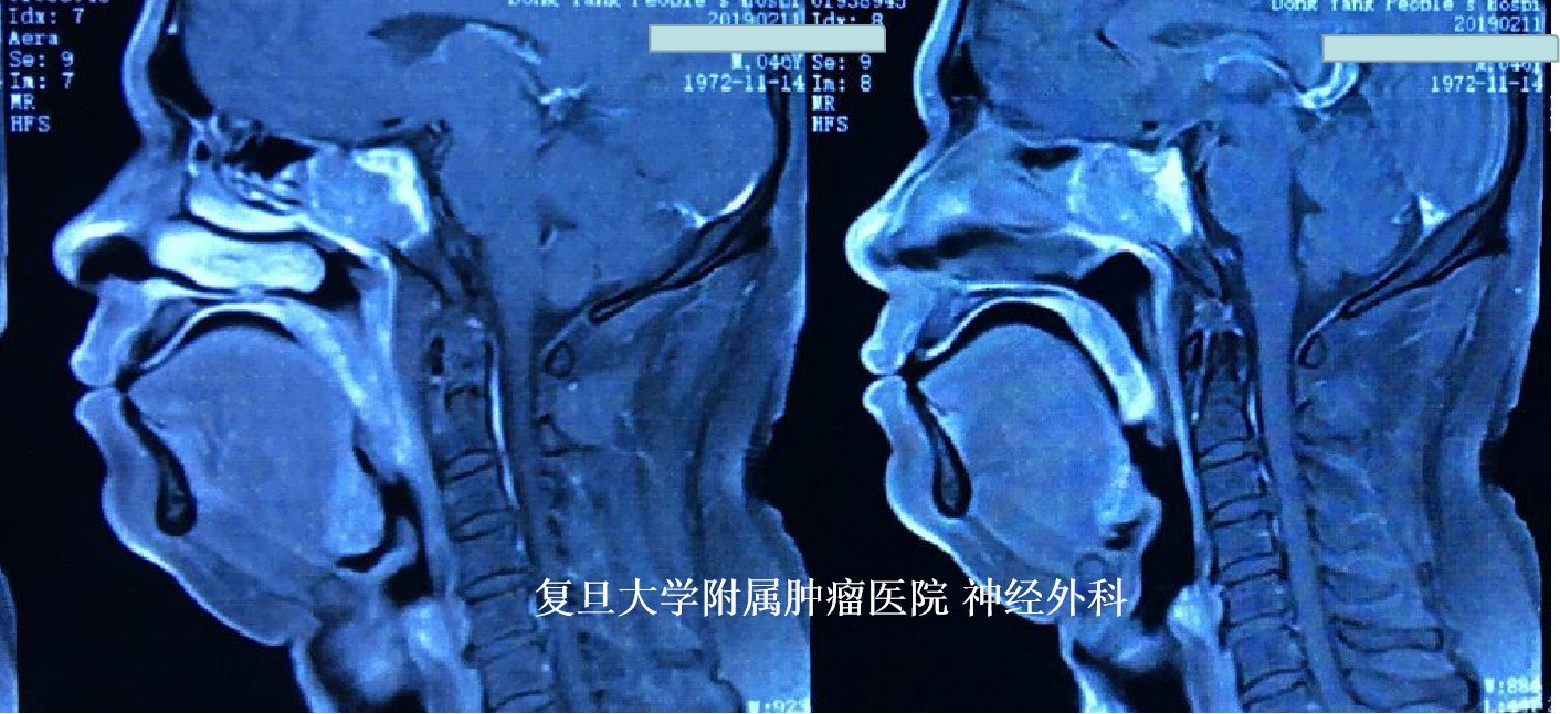 患者为中年男性,头痛头晕3个月,头颅MRI检查示:鞍区占位,主要累及斜坡及蝶窦,侵袭性生长,有强化,周边重要神经血管结构受累,考虑恶性肿瘤可能。