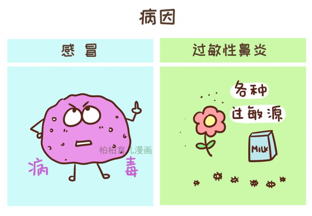 从病因上来看:感冒是由于病毒或细菌导致的呼吸道感染,发病的主要原因是由于人体本身免疫力下降,病毒或细菌趁虚而入导致的。而过敏性鼻炎由于是人鼻黏膜对某种物质产生的免疫变态反应,是由变应原导致的,主要分为吸入性变应原和食物性变应原。常见的吸入性变应原包括:屋尘螨和粉尘螨、花粉、动物皮屑以及真菌变应原等。食物变应原对婴儿来说,多数是由牛奶和大豆引起的;对成人来说常见食物变应原包括:花生、鱼、鸡蛋、牛奶、大豆、苹果、梨等。其中吸入性变应原是变应性鼻炎的主要原因。因此机体遇到过敏原如尘螨、花粉等症状会加重。