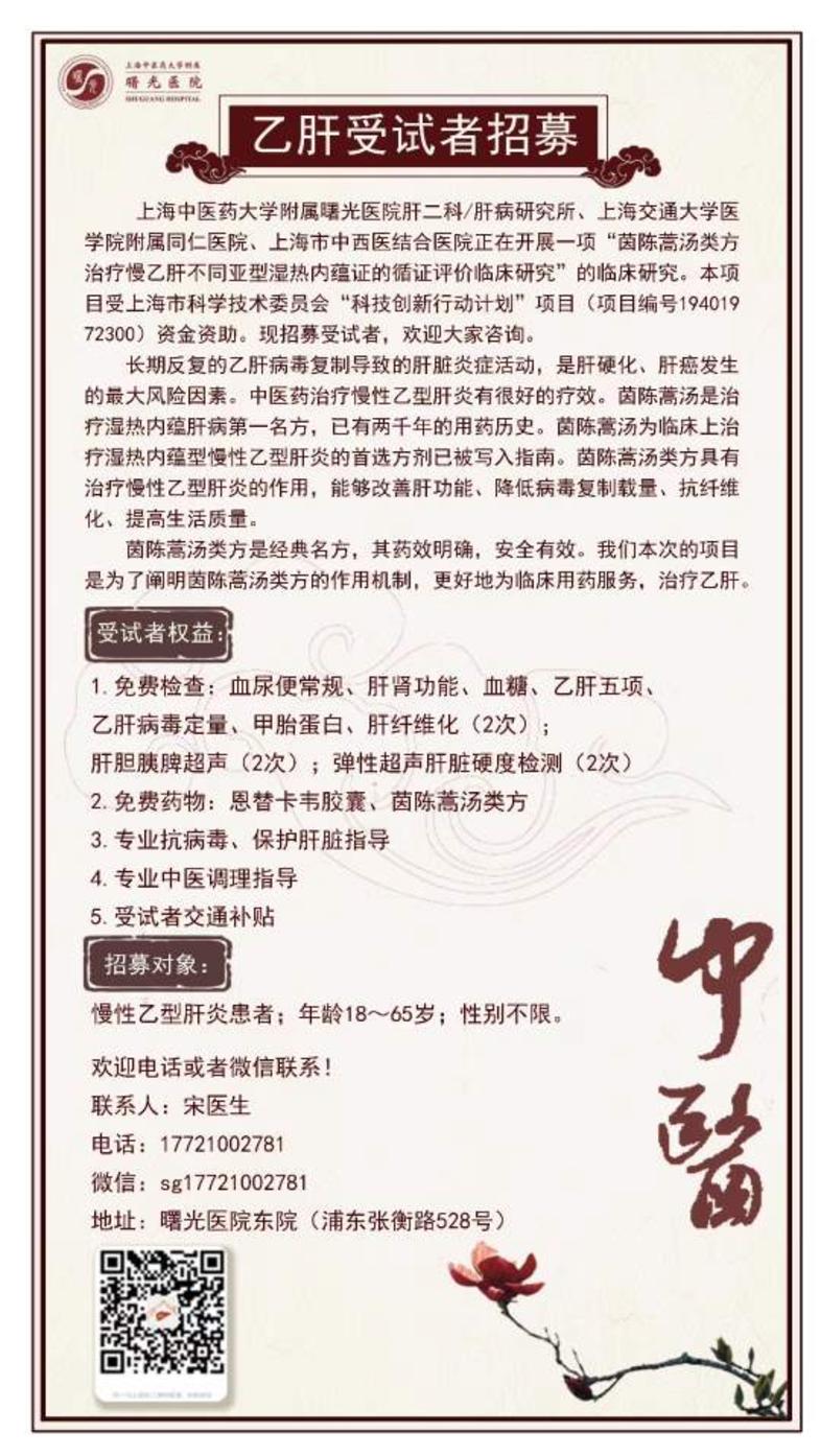 两千年的经方免费治疗慢性乙肝 2020年09月25日 8570人阅读 返回文章列表 这是上海中医药大学附属曙光医院孙明瑜教授主持的一个上海市科技委员会的项目,为大家提供优质的医疗和指导。《伤寒论》经典方剂治疗,两千多年的经典名方,中西医结合治疗安全有效。目前已经有数位完成治疗出组患者,效果很好,不只是肝功能恢复正常和病毒检测不到,身体各方面都明显好转!欢迎大家联系我们!也欢迎多多转发,让更多的人受益![握手][握手][抱拳][抱拳]直接联系宋博士!@ 顶 3 分享到: