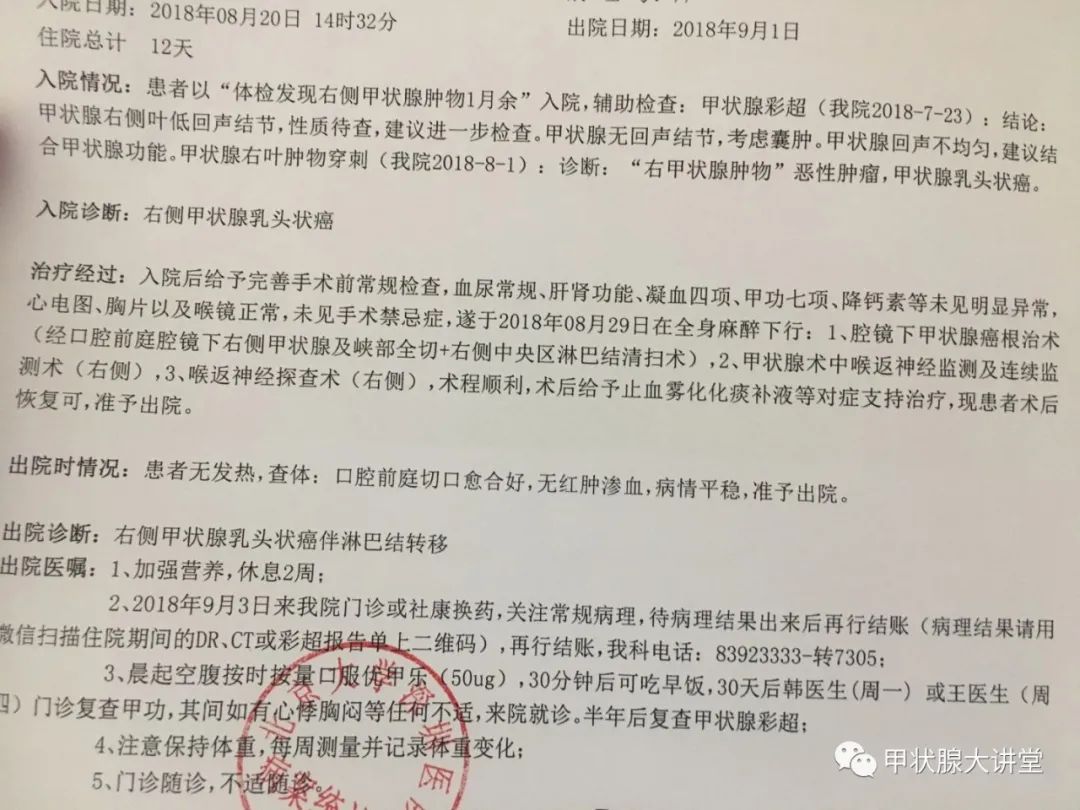 PS:经口手术并不是所有病情都适合,主治医师说右侧甲状腺结节,以及位置中上,才适合经口手术。