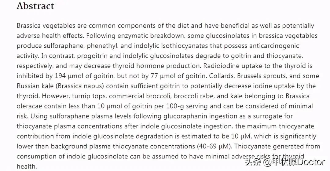 研究人员得出结论,尽管羽衣甘蓝、球芽甘蓝和一些俄罗斯甘蓝(甘蓝型油菜)含有足够的致癌化合物,可能会干扰甲状腺对碘的摄入,但并非所有十字花科蔬菜都是如此。研究人员发现,每100克萝卜头、花椰菜、椰菜和羽衣甘蓝含有不到10mmol的致甲状腺肿化学物质,因此可以认为这些蔬菜对甲状腺有害的是风险很小的。