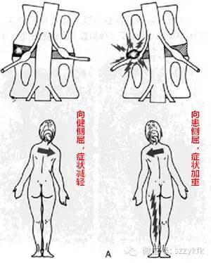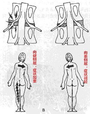 从体态变化看腰突的类型---“肩上型”与“腋下型”的腰突 2018年11月21日 25057人阅读 返回文章列表 椎间盘突出从椎间盘和神经的关系上分,可以有肩上型和腋下型。不同的突出关系,会导致不同的体征。对我们的治疗也有很好的指导作用。 若突出椎间盘在神经外侧(肩上型),患者脊柱向健侧弯时无疼痛,若向病侧弯则疼痛放射到小腿。如下图A: 若突出椎间盘在神经根内侧(腋下型),患者向健侧侧弯则有放射性痛,若向病侧侧弯则无疼痛。如下图B: 假如突出椎间盘顶起神经根,或两者之间已有粘连,则无论向病侧侧弯或向健侧侧弯都有疼痛。 这个体征在临床上可以指导保守治疗方案和术前评估。 腋下型进行腰椎牵引可以减轻神经根刺激症状,但如对肩上型患者进行腰椎牵引却会导致症状的加重。 同时肩上型手术时对神经根的牵拉较少,腋下型损伤神经根和硬膜的手术风险大一些。 顶 1 分享到: