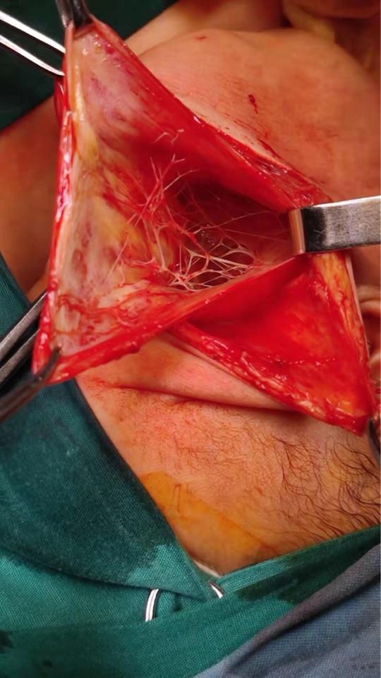 典型特征为沿疏松结缔组织间隙呈“爬行性”生长,大小不等,其形状与周围组织间隙相吻合,与周围肌肉或脂肪等组织结构分界清晰。邻近血管或肌肉有包饶或移位现象,范围可上达颌下间隙甚至颞部,下至纵膈,向外可达腋窝。CT上表现边界清楚、单囊或多囊、水样密度肿块、密度均匀,囊壁多菲薄或不能显示。单囊型主要表现为圆形或类圆形,而多囊型则呈现出不规则形,或可见囊内分隔呈网状轻度强化(图5B~C),增强囊壁及分隔轻度强化,囊内不强化。当伴有囊内出血时,可见囊内增高的片状密度影,可能出现“液-液平面”征像,上层液体为低密度,下层液体为血细胞沉积的缘故,呈高密度。