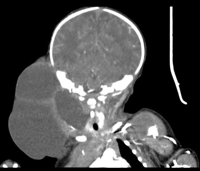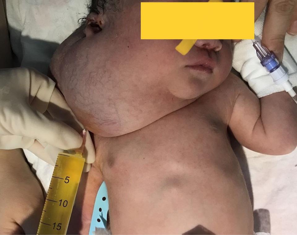 LMs约占婴幼儿良性肿瘤的5%,好发于颈后三角区,向下可达肩、腋下和胸上部,甚至延伸至上纵隔内,约有80~90%的病例发生在2岁以内,无性别差异。头颈部LMs约75%~80%为囊状淋巴管瘤,LMs可以是圆形、分叶形或海绵状,表面皮肤色泽正常、外表多光滑、无痛、呈充盈状态、触之极度柔软、波动感明显、边缘较清晰、透光试验提示阳性(图5A),但如果肿物部位较深或有内出血和感染则失去透光性。当有感染或囊内出血发生时,肿物可突然增大,张力变大,触之较韧,同时可引起面容改变、呼吸困难、吞咽困难、面瘫、声嘶等表现。可呈单房或多房,多房之间液体多有相通,囊壁和分隔均菲薄,其内含有无色透明或淡黄色清亮淋巴液,伴出血时可呈血性浆液。根据形态学,LMs可分为大囊型(直径>2cm)、微囊型(直径<1cm)、混合型。