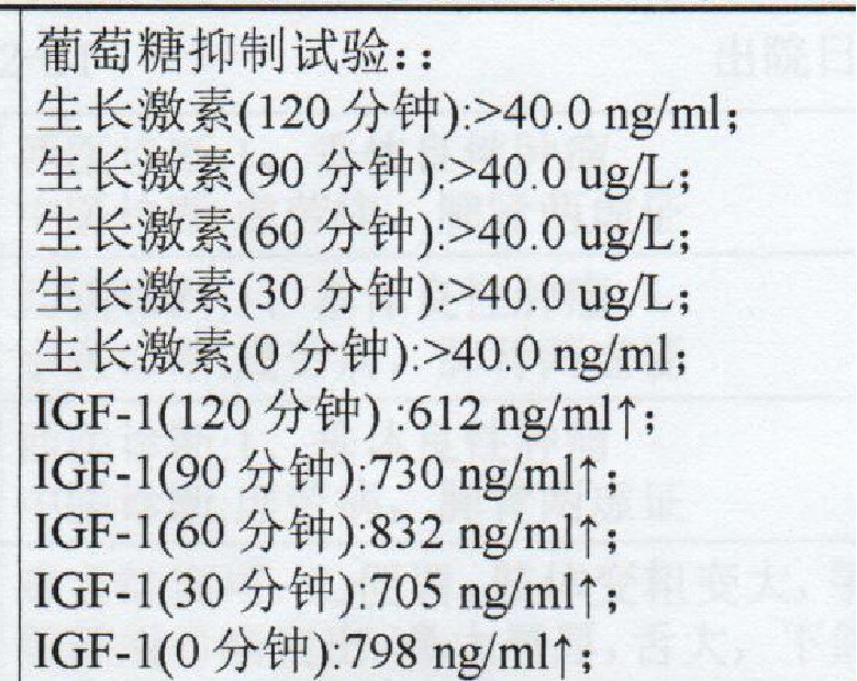 进一步检查激素提示:GH及IGF-1明显升高,OGTT试验不能明显抑制GH水平。