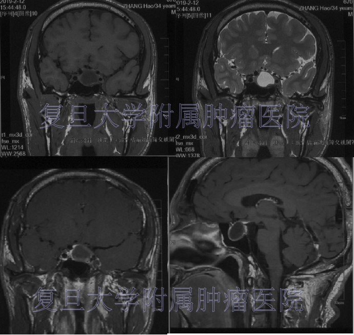 进一步查磁共振检查示:鞍区囊性占位性病变,T1低信号,T2高信号,增强后周边环形强化。遂就诊于我院神经外科。