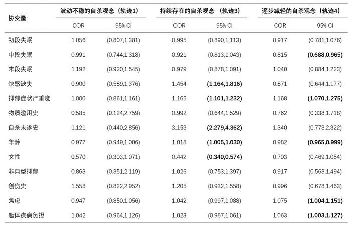 以轨迹2(没有或几乎没有自杀观念)作为参照;粗体表示有统计学显著意义的协变量