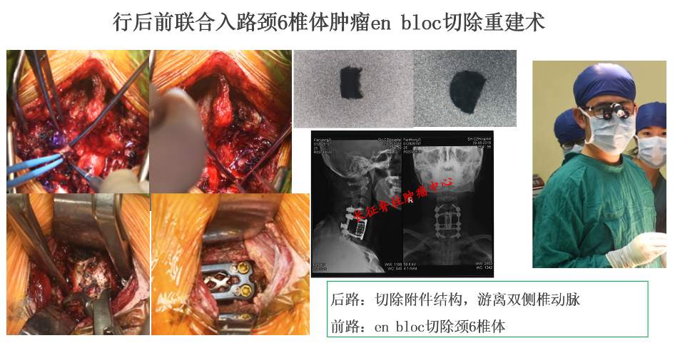 图二.长征医院骨肿瘤科团队经过详细检查,为其实施了颈椎肿瘤enbloc整块彻底切除手术,这是治愈脊柱骨巨细胞瘤的最佳术式,但是手术难度较好,需要高水平成熟的外科团队。