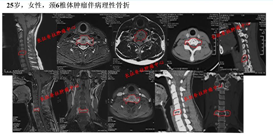 图一.青年女性,颈肩部剧烈疼痛,C6椎体溶骨性破坏,伴发病理性骨折,存在瘫痪风险。