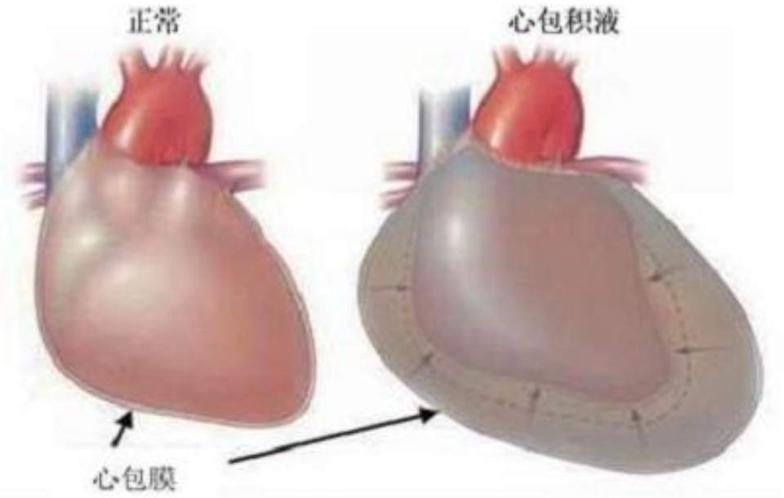 正常心包腔内有15-50ml液体起润滑作用。液体增多即是心包积液,积液迅速或积液量达到一定程度,可造成心输出量和回心血量下降而产生临床症状,即心脏压塞。示意图如下。
