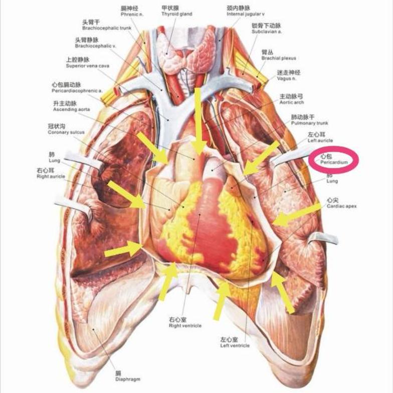 心脏被覆浆膜性心包(脏层和壁层)和外裹纤维性心包,类似于物品的两层内包装和一层外包装。脏层包于心肌的表面,形成心外膜。壁层衬贴于纤维性心包的内面,与纤维性心包紧密相贴。脏、壁两层浆膜性心包之间的潜在腔隙即心包腔。下图黄色箭头所指为纤维性心包。