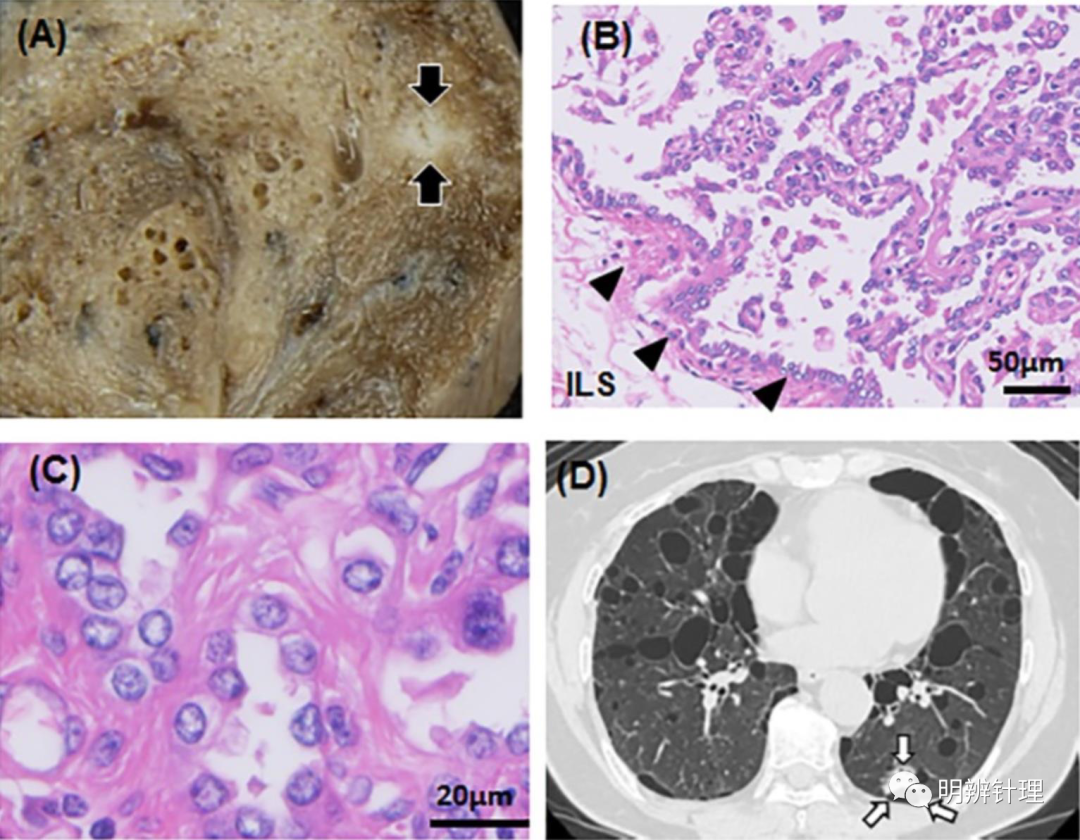(A)大体病理,箭头显示白色结节。(B) 苏木精和曙红 (HE) 染色。病变与小叶间隔 (ILS) 接壤,如箭头所示。(C)病变的进一步放大。丰满的肺细胞具有增大的细胞核,没有明显的异型性和有丝分裂。肺泡隔被致密纤维增厚。(D)CT显示多个囊肿和箭头指示的磨玻璃不透明病变。