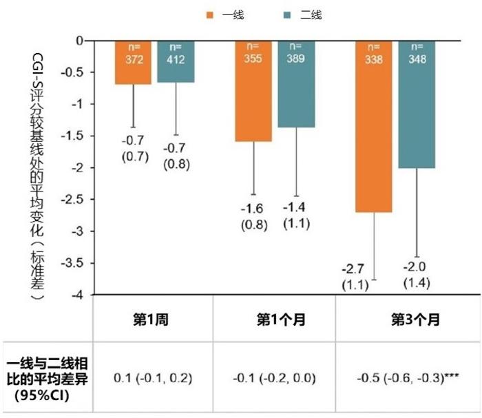 图2 伏硫西汀作为一线治疗与二线或后续治疗相比CGI-S评分的改善(*** p<.0001)