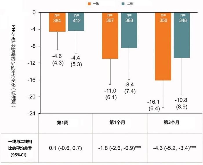 图1 伏硫西汀作为一线治疗与二线或后续治疗相比PHQ-9评分的改善(*** p<.0001)