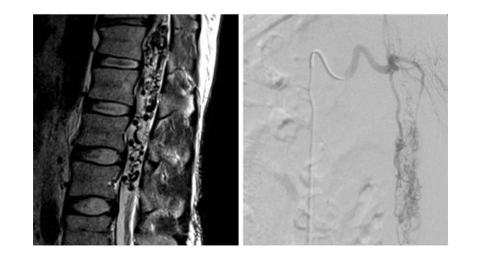 图5:磁共振矢状位(左)和脊髓血管造影前后位(右)显示髓周动静脉瘘。注意到马尾区域粗大迂曲扩张的髓周血管流空影。患者行导管内栓塞治疗。由于涉及马尾区域,如采用开放手术很难全切病变。