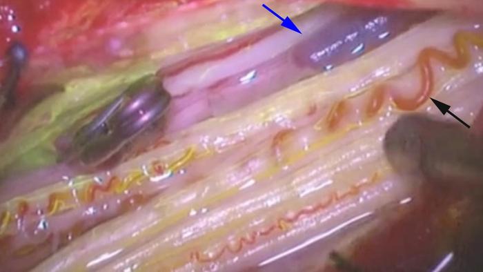 如硬膜切开后未发现明显动脉化的引流静脉,笔者会检查术前所怀疑的神经根四周,如仍无法发现,则可行侧位X光以确认暴露节段是否正确。正如上述所提及,术中荧光血管造影可用来检查附近 静脉的早期显影。