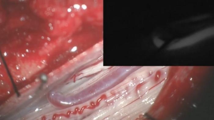 阻断瘘口会使动脉化的引流静脉由红色变为蓝紫色。术中可用荧光血管造影来确认是否成功阻断(ICG或荧光素)