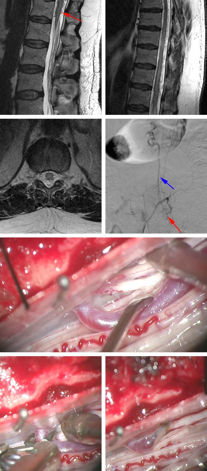 图3:图中磁共振所示图片来自一名表现为一过性下肢轻瘫症状的52岁男性。首次MRI检查除马尾部位血管扩张外未发现其它明显异常(左侧最上图,箭头)。胸部磁共振显示出硬膜内脊髓背侧血管增多(右上图)。脊髓血管造影显示L1脊膜动静脉瘘并脊髓背侧扩张的动脉化静脉(第二排;红色箭头指示瘘口,蓝色箭头指示脊髓背侧动脉化的静脉)。术中探查发现瘘口引流静脉位于脊髓背侧L1神经根入口处(第三排;神经根入口处位于吸引头尖端)。术中先行临时阻断夹阻断瘘口,双极电凝处理瘘口处引流静脉,断开动静脉间异常交通(底图),然后去除临时阻断夹,硬膜水密缝合。