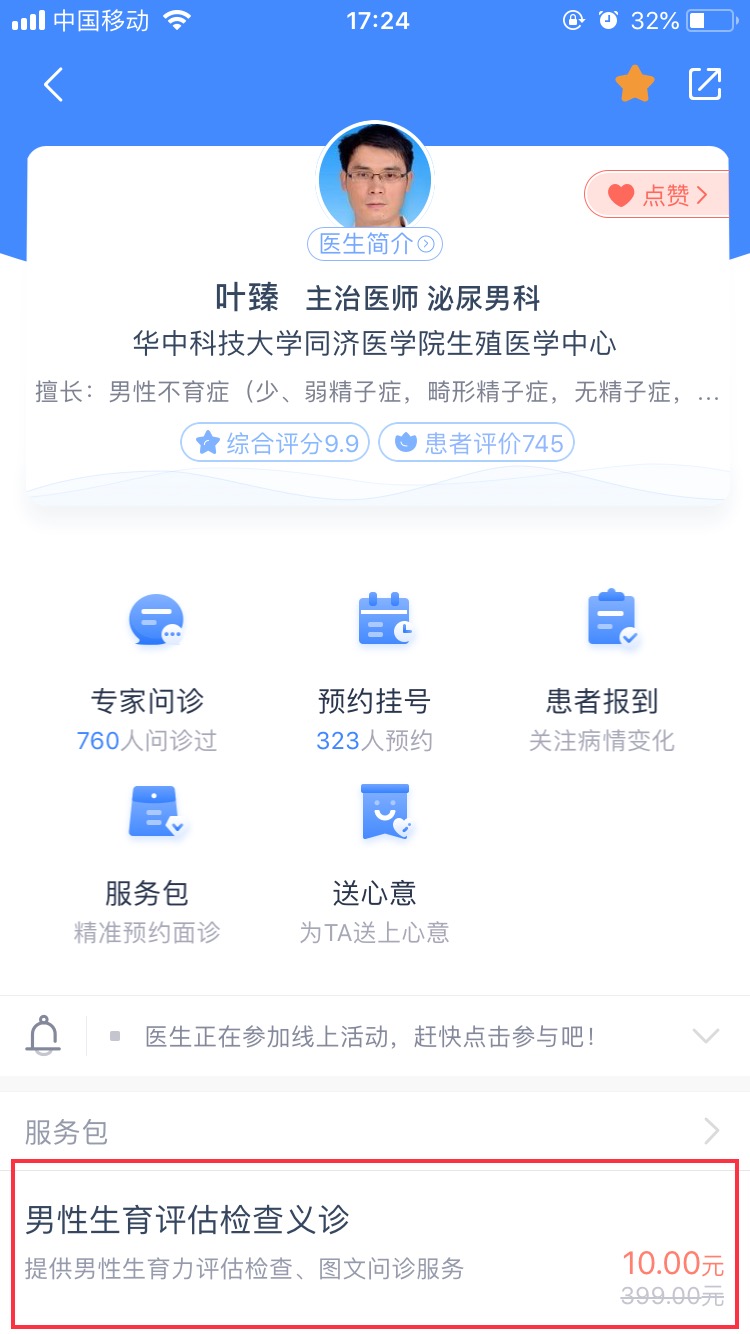 线上活动:活动期间购买男性生育评估检测义诊服务包并绑定就诊人信息即报名成功,通过服务包内图文与我沟通,符合要求的患者,即可来院享受男性生育力评估免费检查。(名额有限!)