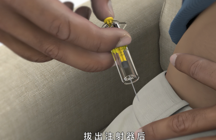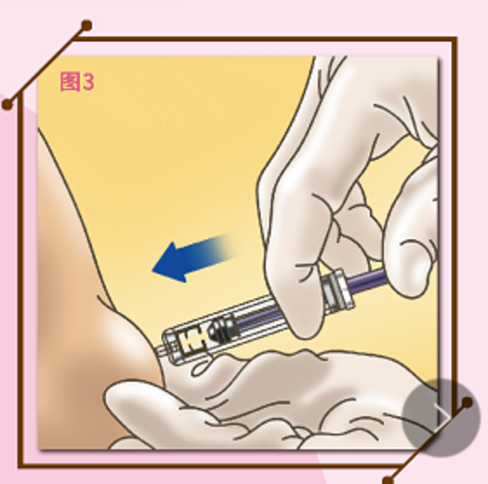 2、将针头朝下,空气弹至药液上方(不用排气),左手捏起皮肤形成褶皱,右手垂直进针,缓慢注射,10秒内完成即可