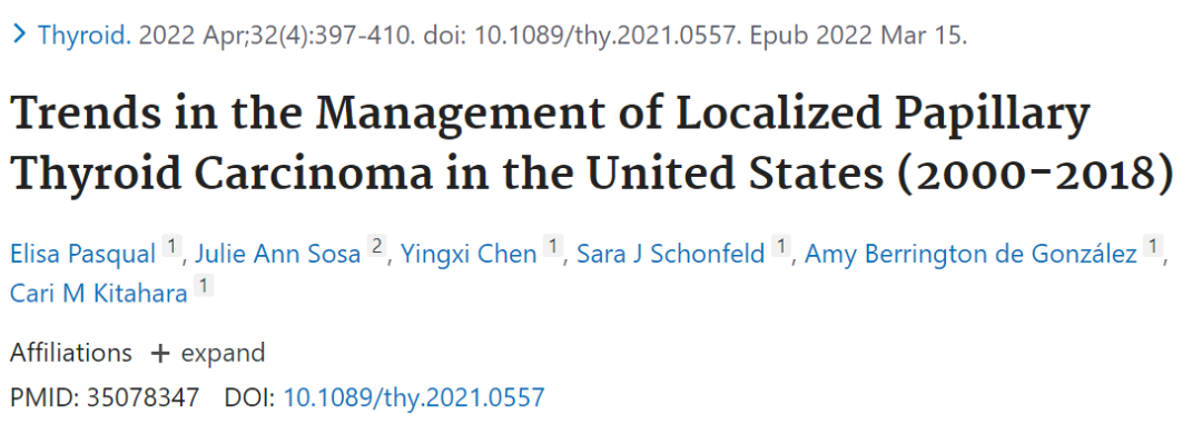 对甲状腺乳头状癌(PTC)过度诊断和治疗证据的回应,2009及2015年的美国甲状腺协会(ATA)成人指南建议缩小手术范围 (腺叶切除与甲状腺全切除),更加严格地限制了复发风险低危的甲状腺乳头状癌患者术后放射性碘治疗(RAI)的使用。2015年,ATA建议对于一些小于1cm的PTC患者(微小乳头状癌),可以选择主动监测。同年,ATA的儿童指南也更严格地限制了低风险PTC儿童患者的放射性碘治疗,但这些建议对低风险成人和儿童PTC患者治疗的影响,尤其是在2015年以后,尚不清楚。