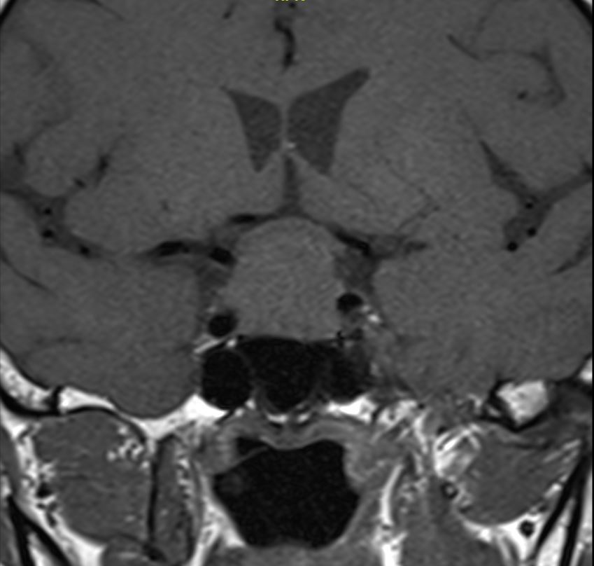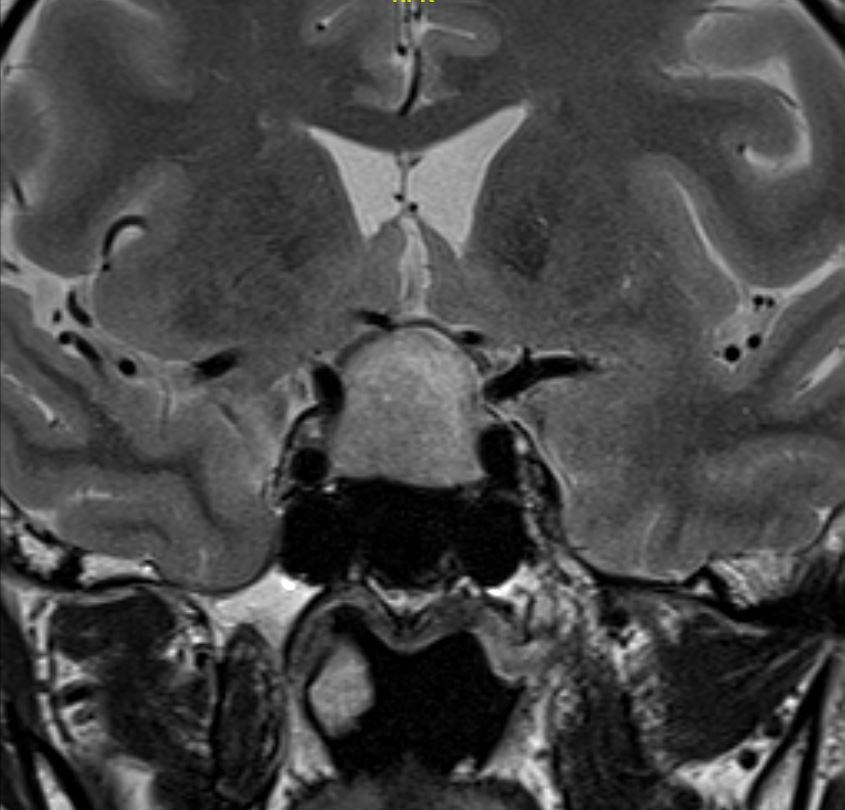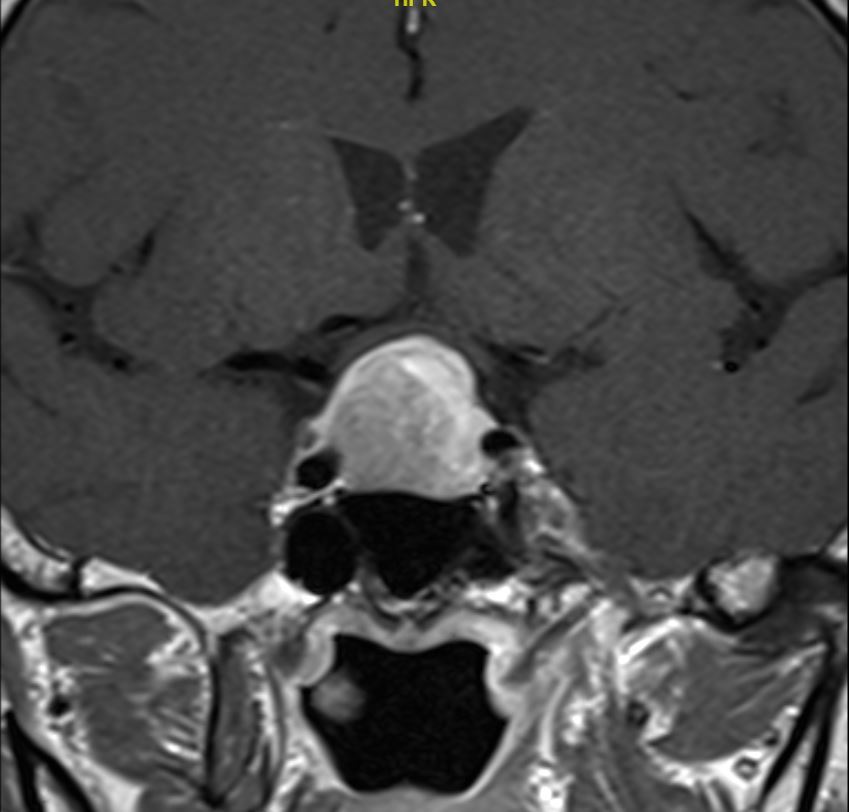 患者为63岁患者,因头痛伴有视物模糊2个月前来就诊,检查头颅MRI检查发现鞍区占位性病变,肿瘤大小2.3cm,向上生长压迫视交叉,两侧侵犯海绵窦。