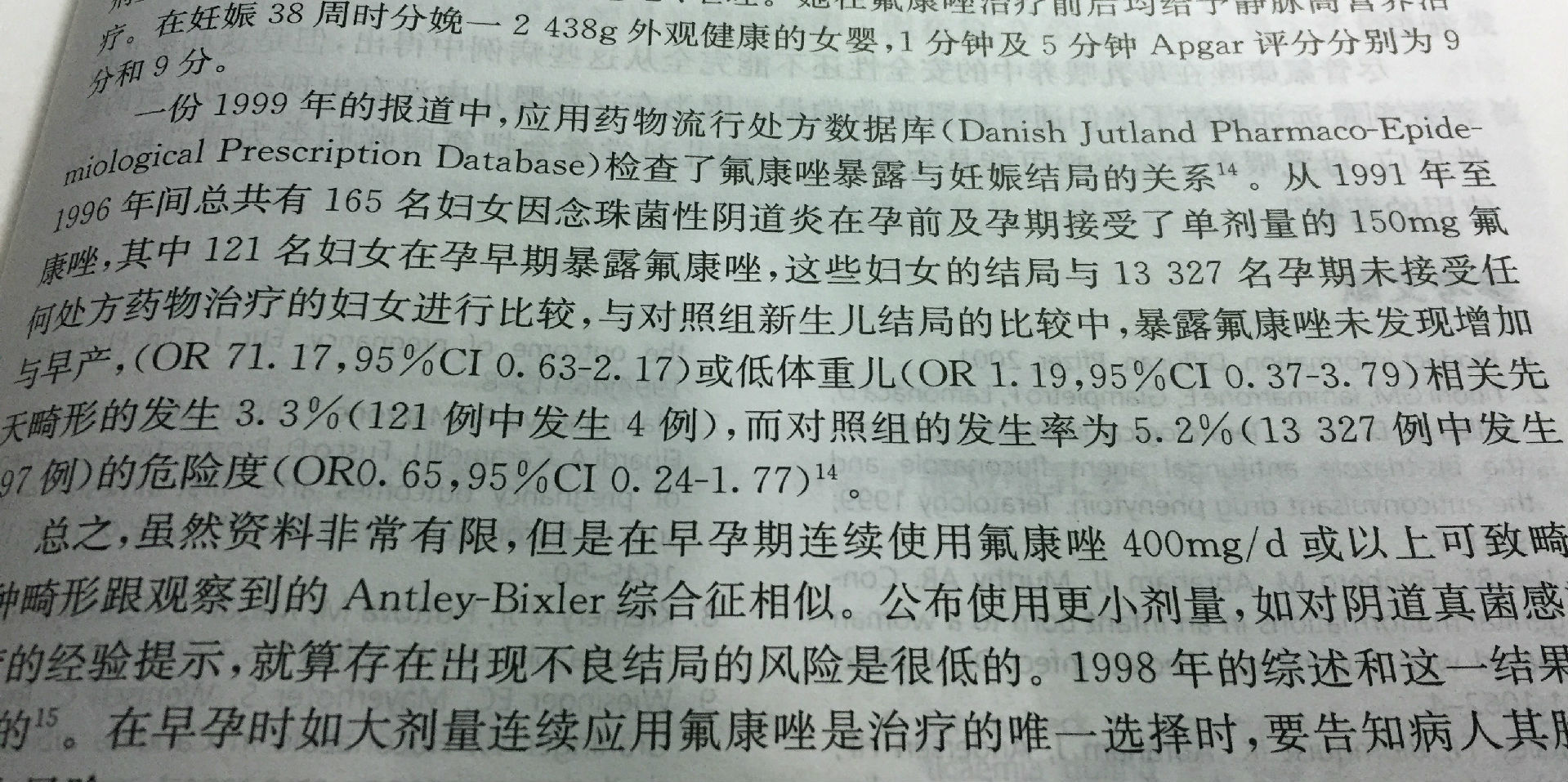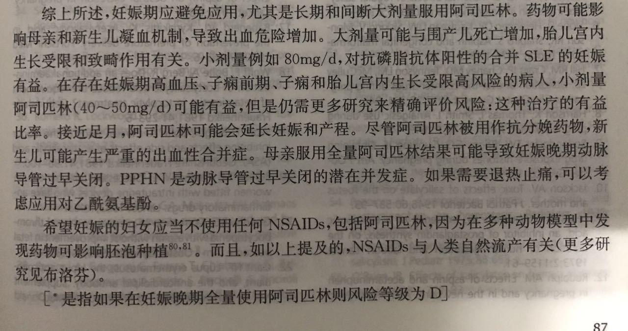说雌激素有致畸风险,阿司匹林,强的松哪个没有致畸风险。只是这些我不愿意说而已,因为我不想那些孕期使用的人担心。补充个叶酸有人说可以导致胎停就有人信了,叶酸导致胎停可缺少学术证据。那被用来保胎的阿司匹林和流产是否相关呢?平日里我都念松箍咒,今天我也念一个紧箍咒。以下图片转自人民卫生出版社《妊娠期和哺乳期用药》87页和1034页,由上海一妇婴段涛教授主译。