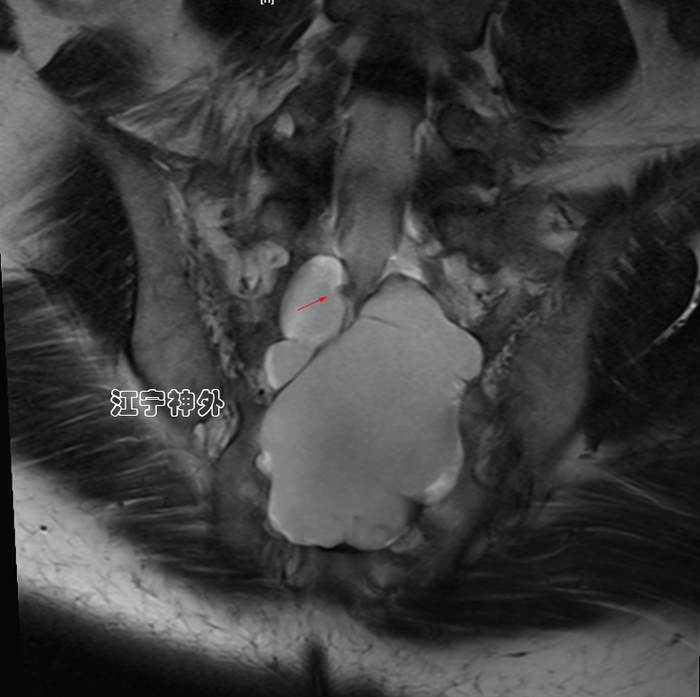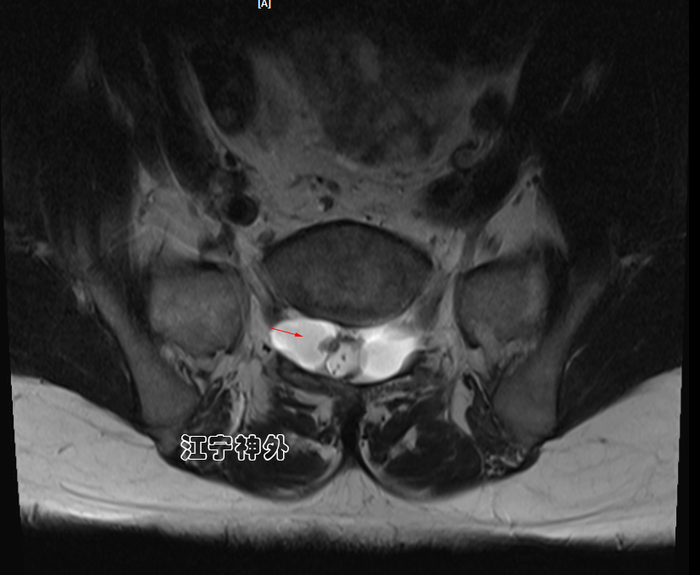 郑主任仔细阅片发现,右侧骶管囊肿虽然比较小,但是其脑脊液漏口处(囊颈)存在一块灰色异常信号,推测可能存在神经根内疝。