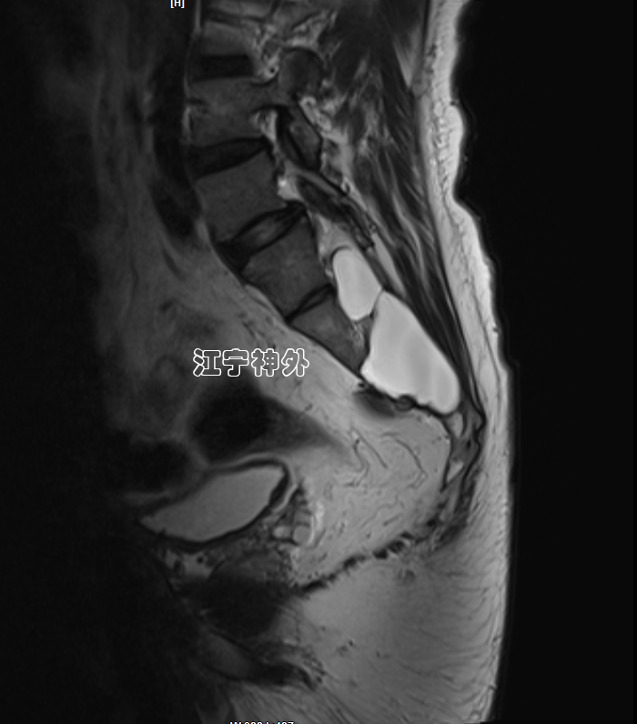 我院术前磁共振检查发现,骶1-3两个巨大骶管囊肿,其中左侧骶管囊肿更大,但症状却是在右侧。