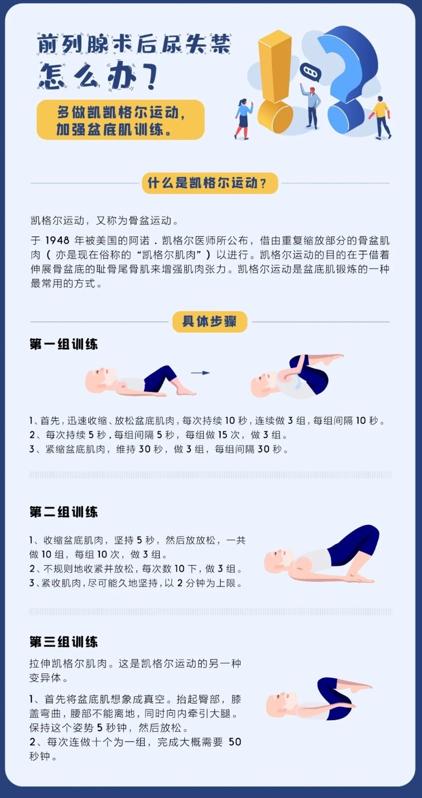 锻炼时机和频次:术后拔出导尿管(一般术后2-3周)后开始练习收缩盆底肌肉。一开始少一些,每天大概50-60次,分组练习。术后2-3个月后,逐步增加到每天200-300次,最终每天300-400次,分组练习。