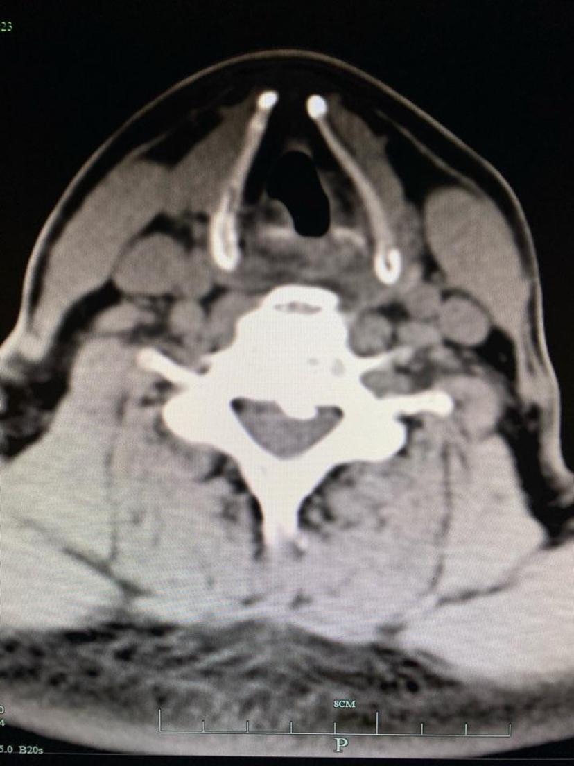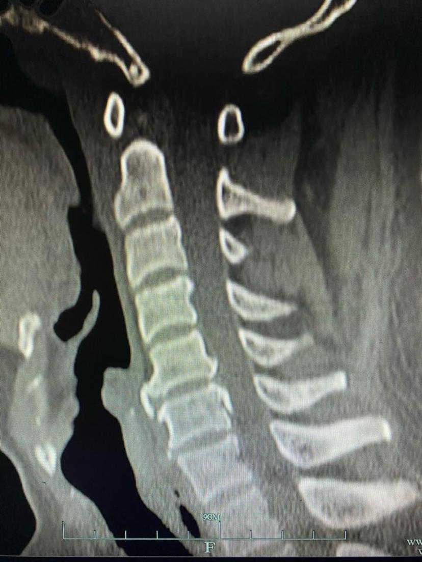 CT显示颈5-6层面后纵韧带骨化及大量骨赘