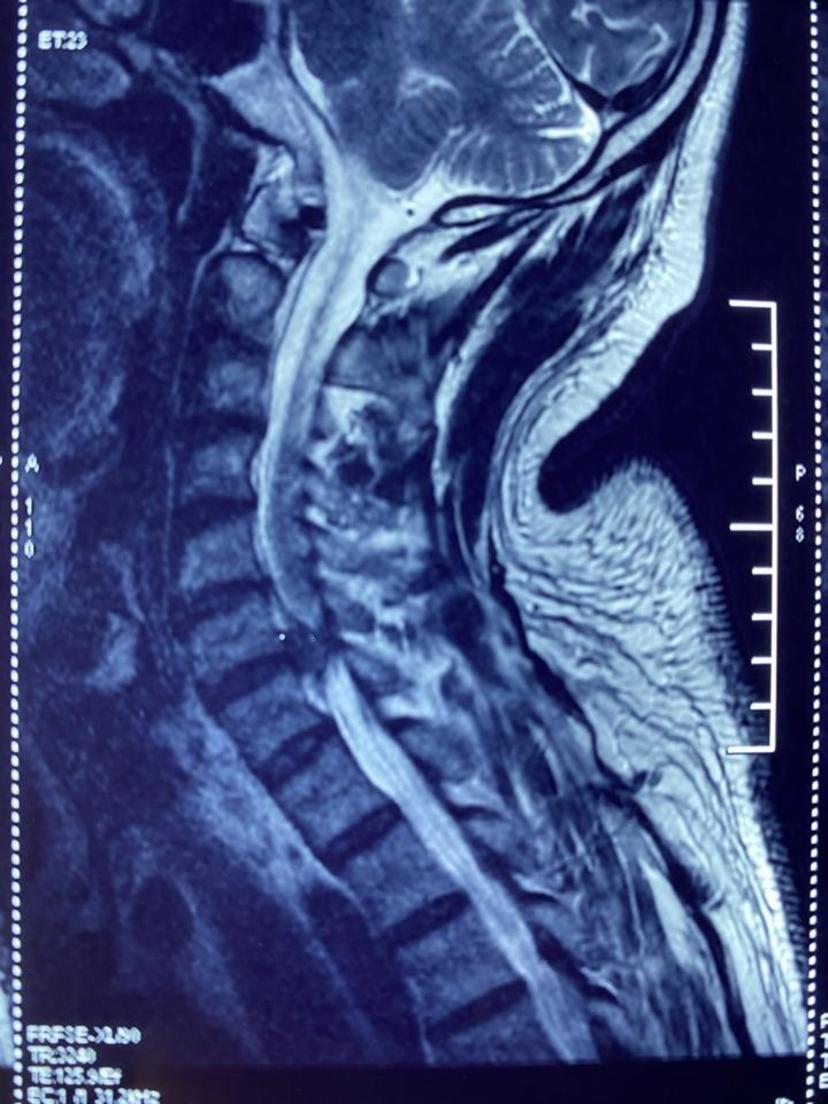患者颈部疼痛,上肢酸痛麻木,行走不稳,经过颈椎磁共振+颈椎CT检查,颈6-7椎间盘脱出导致椎管狭窄,颈5-6层面后纵韧带骨化及大量骨赘,均采用前路单间隙减压微创术式,避免了椎体切除,术中出血少、手术时间短、术后三天出院,不适症状完全消失!磁共振显示颈6-7椎间盘脱出占满整个椎管空间,脊髓完全受压