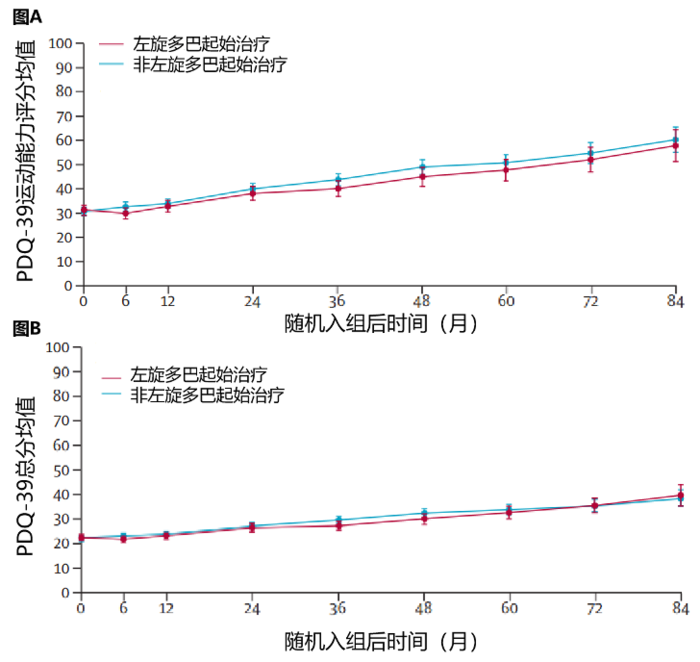 图1:左旋多巴起始治疗与非左旋多巴起始相比,PDQ-39评分和异动症发生风险