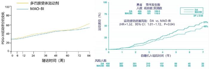 在非左旋多巴治疗组中,MAO-BI的平均PDQ-39运动能力评分比DA组多改善了1.4分(p=0.05),总分改善了0.8分(p=0.05)。另外,MAO-BI异动的发生与DA相当;但运动波动显著少于DA(图2)。