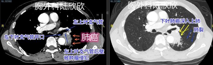 术前我院我院气管镜:会厌、声带未见异常,气管粘膜光滑,环状软骨清晰、隆突锐利,右主支气管粘膜及各叶段开口均未见异常,左下叶开口新生物,平次级隆突水平(上下肺的支气管交界处),予活检。病理:左下叶开口进行活检:鳞状上皮高级别上皮内瘤,癌变。