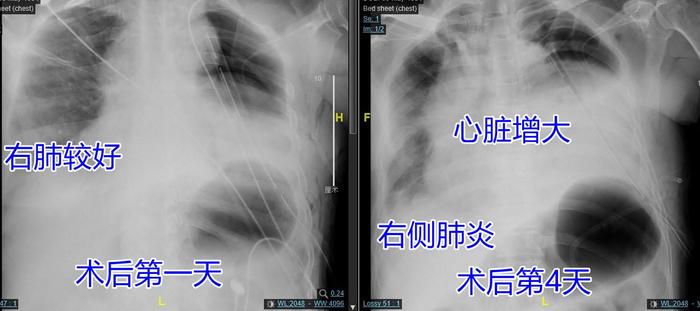 上图,左边的图是术后第一天的床旁胸片,可见右肺较好,心脏还比较正常。右边的图,是术后第4天的床旁胸片,可见右肺里面发白的部分是肺炎,心脏不正常变大。左全肺切除术后发生肺炎比较麻烦,因为已经45%的左肺被切除了,剩下55%的右肺再发生肺炎,又有10%的肺被炎症占据了,所以病人有点气促。