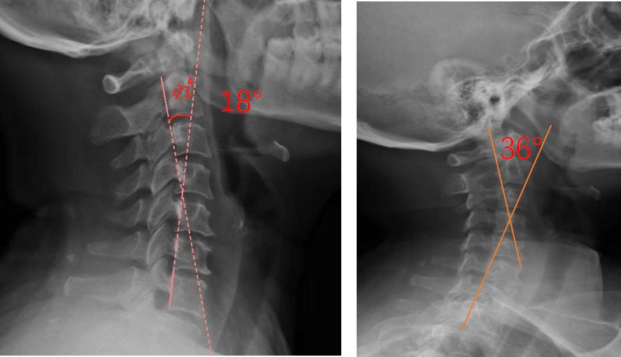患者适配前后侧位X光,佩戴前18°,适配后36°