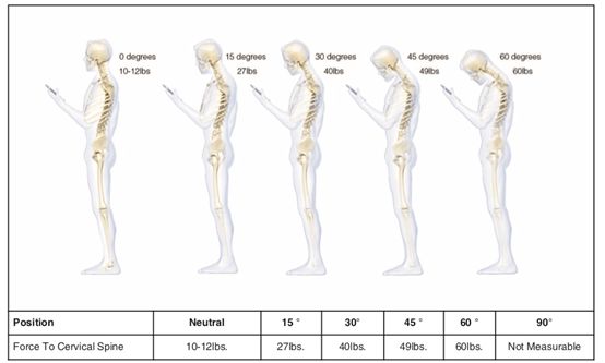 2014年底,美国的Kenneth医生曾发表一篇关于低头角度与颈椎压力的文章,其中的一张图片曾被各大新闻媒体广泛引用。