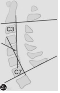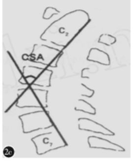 在颈椎侧位X线片,做 C2 及 C7 椎体后缘的平行线,其相交所成的锐角为颈椎角(CSA)。正常角度一般大于34°。