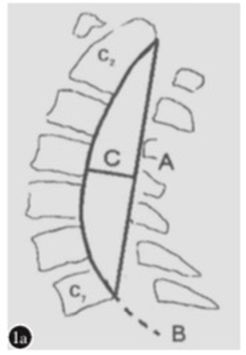 自枢椎(第二颈椎)齿突后上缘到C7椎体后下缘画一直线为A线, 沿颈椎各椎体后缘画一连线为B线, 在A、B线间最宽处的垂直横交线为C线, 即为颈椎生理曲线的深度。