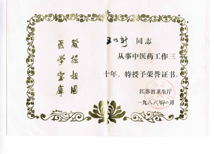 八、下图片证书则是祖父王以鑫(新)33年前由江苏省卫生厅颁发的在临床满三十年工作荣誉证书: